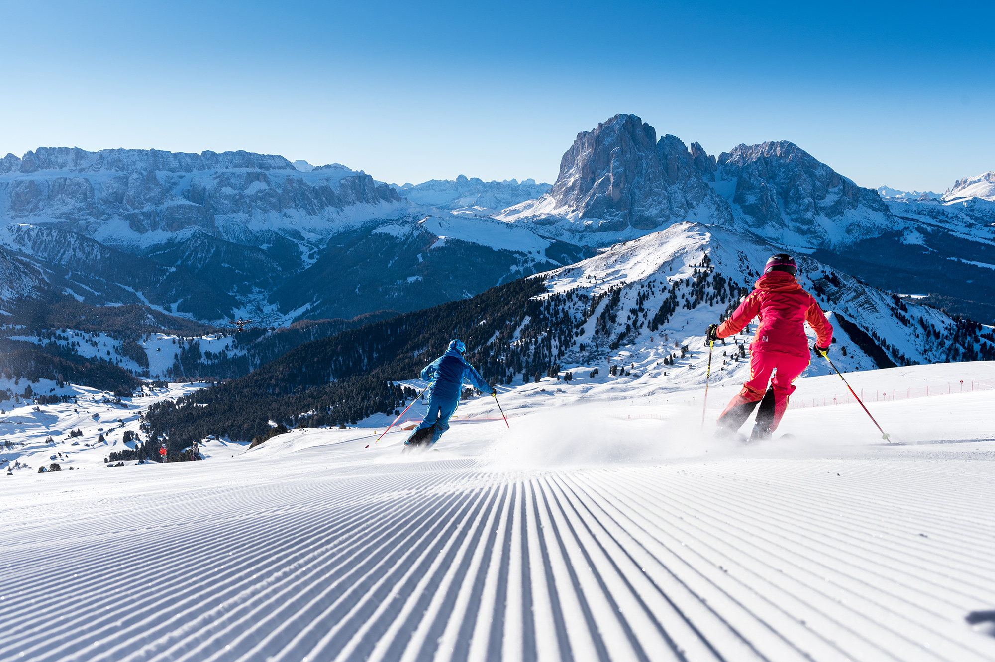 Val Gardena, also known as Gröden in German, is a valley in the Italian Dolomites. The three main towns St. Ulrich, St. Christina and Wolkenstein are all directly connected to the ski slopes and provide direct access to over 79 lifts and 175 km of pistes. With the Dolomiti Superski pass there is even more to explore – 448 lifts and 1,258 km of slopes await visitors across 12 ski resorts all surrounded by the magnificent peaks of the Dolomites UNESCO world heritage site. Val Gardena also provides direct access to the Seiser Alm, a plateau especially suitable for families with kids and beginners.