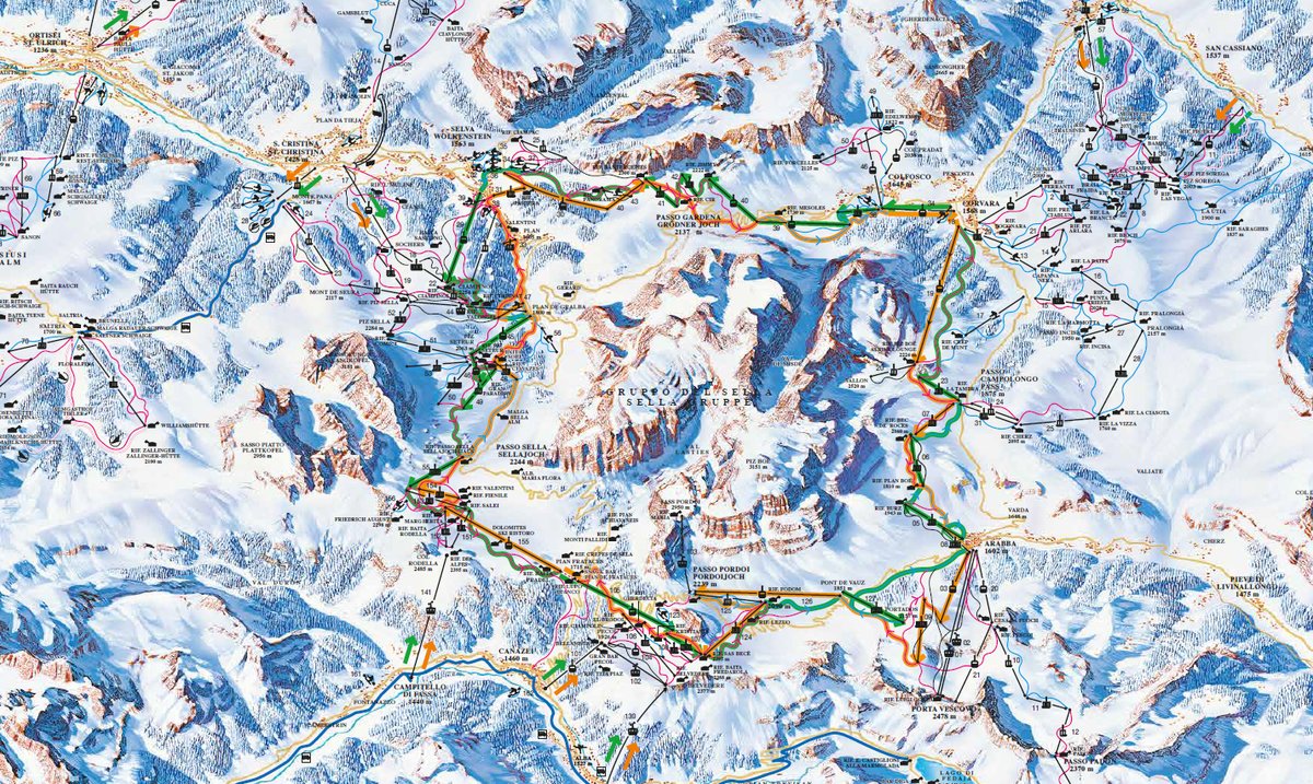 The most famous ski tour in the Dolomites is the Sella Ronda which laps the Sella mountain range. It can be skied in two directions, we prefer the green counter-clockwise variant as it crosses the Sella pass, Pordoijoch, Campolongo pass and finally the Grödner Joch before returning to the Val Gardena valley. The orange variant runs clockwise and can be started and finished from any of the four valleys it passes. The tour is about 30 kilometers skiing distance and can be done by average skiers. More advanced skiers who keep up the pace can do the Sella Ronda twice in one day.